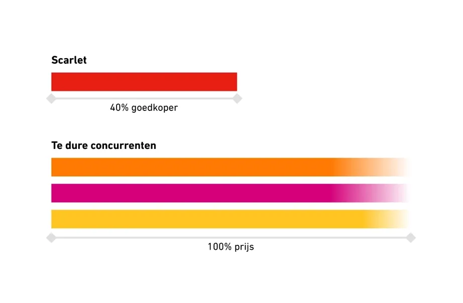 Voor een pack dat onbeperkt internet, digitale-tv via decoder en vaste telefonie combineert, is de gemiddelde prijs €89,69/maand tegenover €45/maand voor Scarlet Trio, een verschil van €-44,69/maand, wat een besparing van €536,28 jaar betekent.